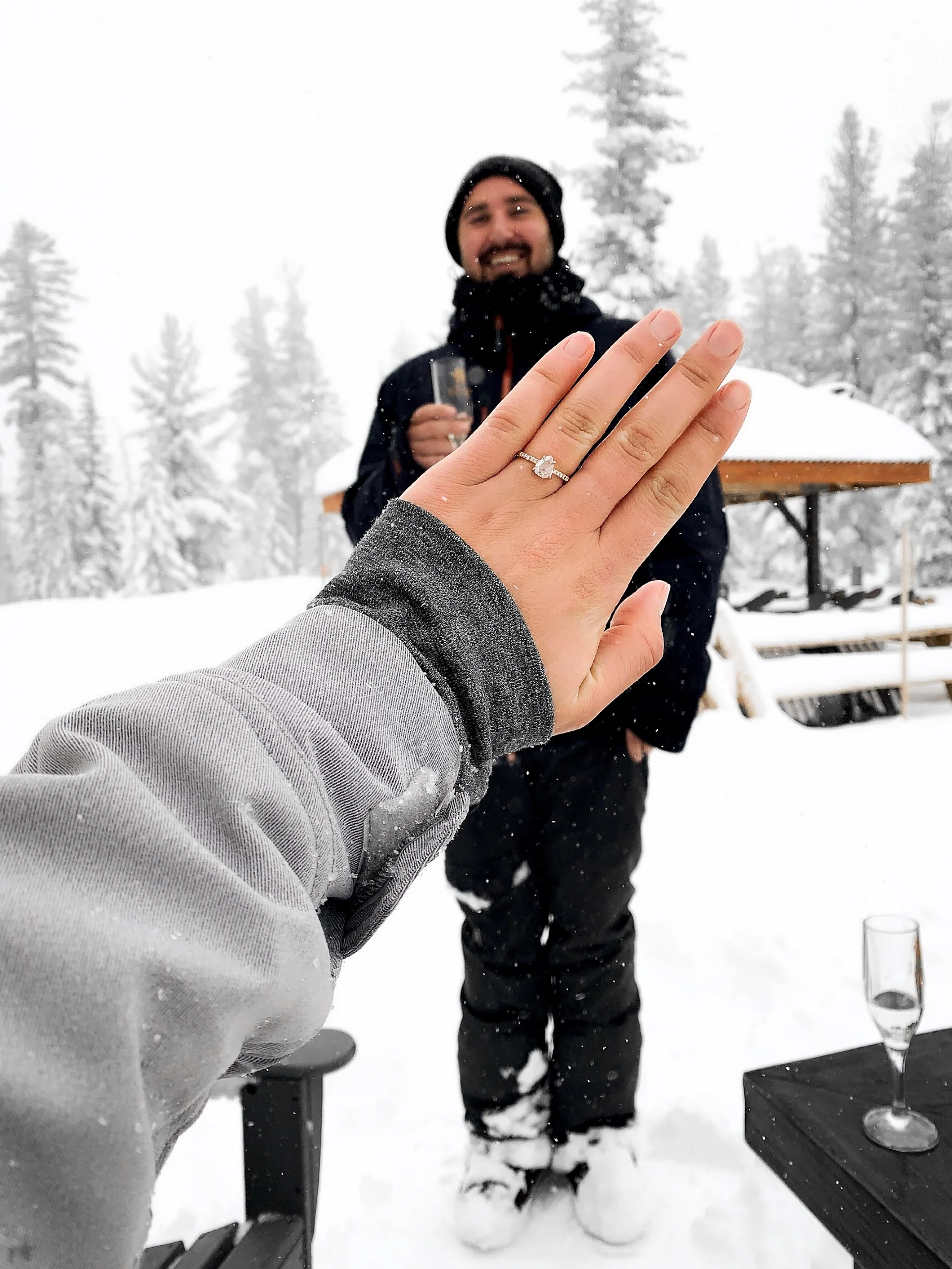 Exactly one month ago Broc and I got engaged!!! On the three year anniversary from our first kiss, Broc slipped this rose gold beauty on my hand while we were snowboarding in Tahoe.