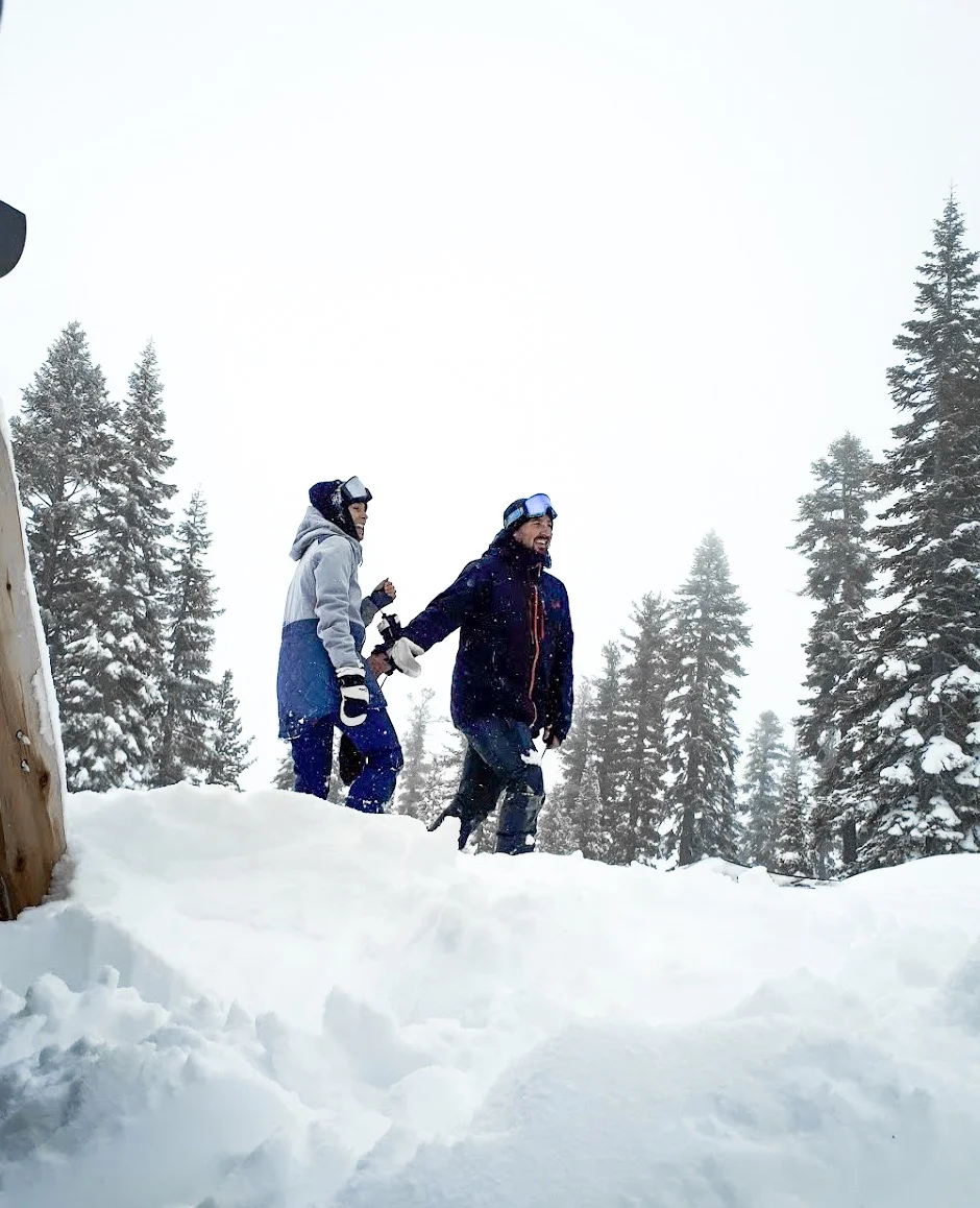 Our proposal story begins like most: one person acting weird and the other cold and irritated. Broc had set it up to propose at the 2pm Northstar Tōst, but it was snowing so hard that it was canceled that day. Broc was acting sketchy all day, and when he didn’t want to drink a beer at the lodge, I knew something was seriously off. He was on his phone and said he wanted to meet up with friends, but he was actually trying to still set it up in secret with the manager. I dropped down into the trees right before the Tōst area and started making my way over to the run where his friends were. Broc comes down and tells me he wants to do that run again because it was fun. I was perplexed because he had just said he wanted to go over to the park. It was at this moment I decided to just surrender to this weird day. We go on the same run and ride up to the Tōst area again and this time he stops and takes his board off. He says he has to go pee and would I come with him? Ummm, okay. He walks up to the closed area and as I’m dragging my board and stomping behind him in the snow, I hear one of our favorite songs come on. I remember thinking “Oh, I love this song!”. It honestly took me way longer than I like to admit to figure out what was going on. Broc turned around, dropped onto one knee and asked me to marry him, cue the ugly tears and me saying “Are you serious?!” more times than I said yes.